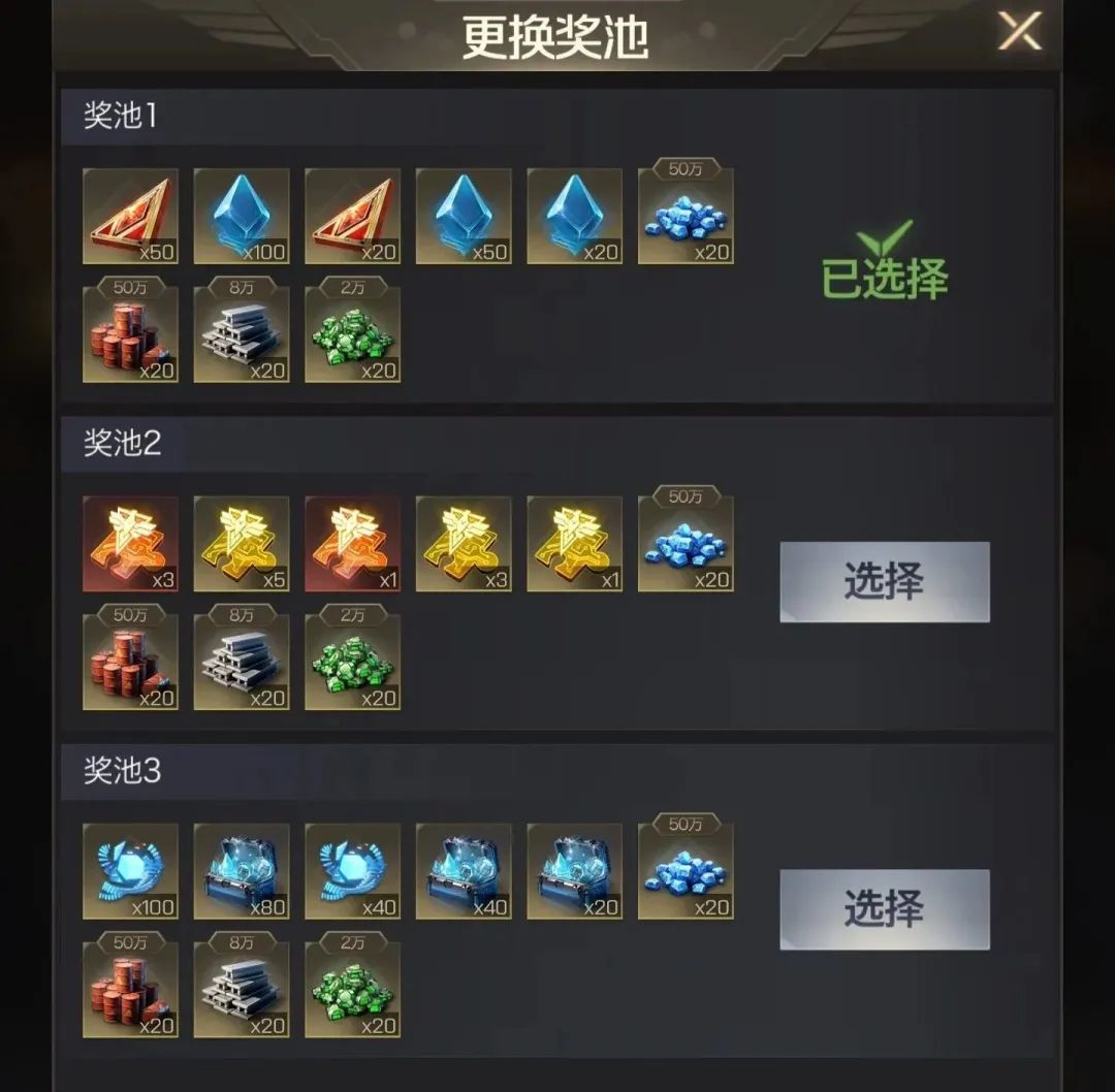 关于奖池选择,还没7红的指挥官,建议优先选择量子扩充石奖池,获取量子扩充石和泰晶;参谋英雄没5星的建议选择荣耀通用碎片奖池,尽快把参谋英雄5星,参谋值低实在是太吃亏,储备一些荣耀通用碎片不会错;还没5阶泰能兵的指挥官踏实选泰矿母体吧,先5阶泰能兵再说,当前5阶泰能兵是比较基础的要求了,总之根据自己的情况规划,缺啥选啥!