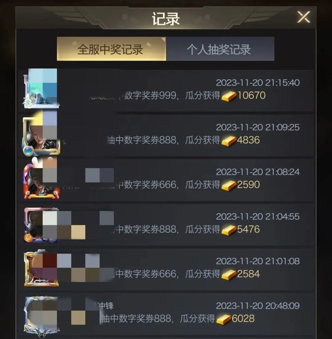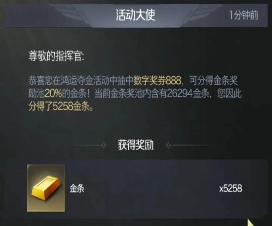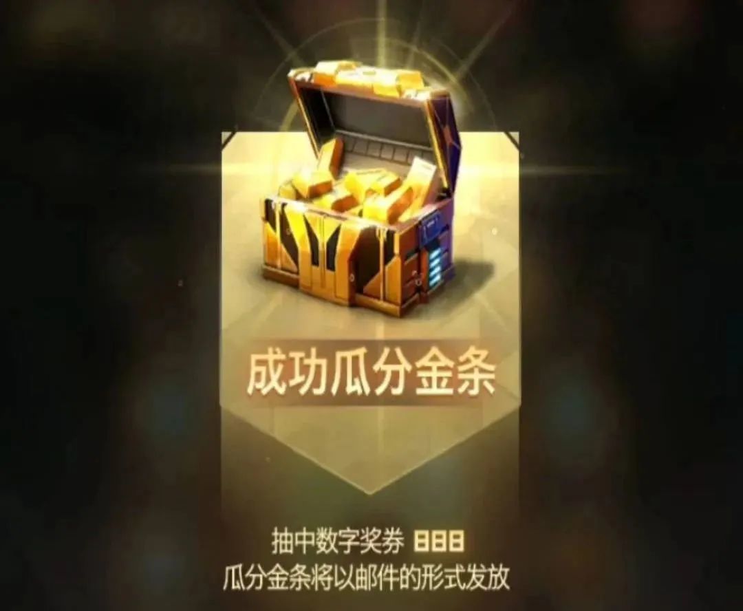 全服的指挥官每次抽取道具时,会往金条奖池存入一定数量的金条;当抽取的数字奖券为特定数字时,可分得金条奖池内一定比例的金条,瓜分金条数量向下取整,金条通过邮件的形式发送。
