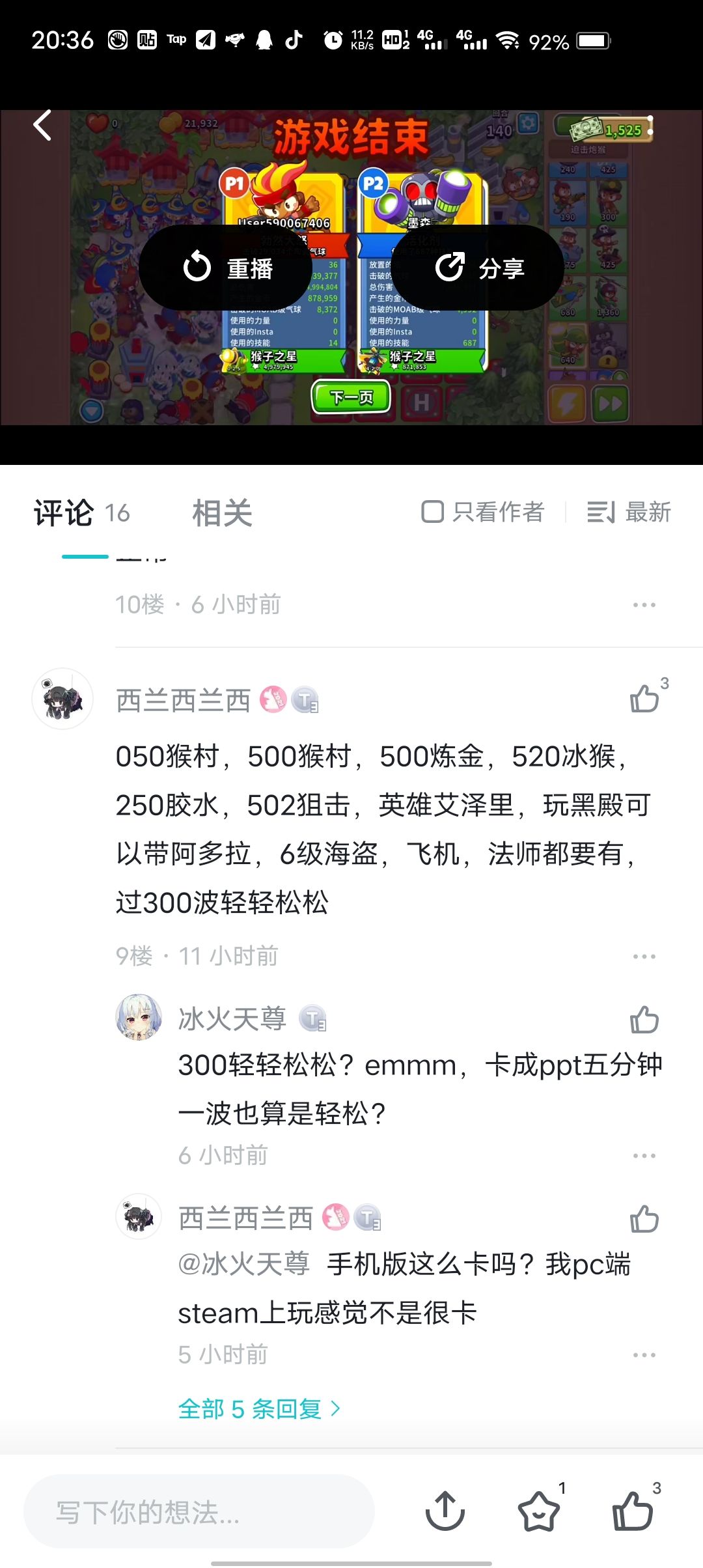 作为一个塔防游戏的小萌新,终极攻略就是多看tap论坛!仅仅是因为在论坛中多看了一眼别的大佬的回复,随便试试水就打到了138关,但有个问题,由于经验不够所以没有全部升满5级,因为如果按照大佬的说法,300关是没问题了