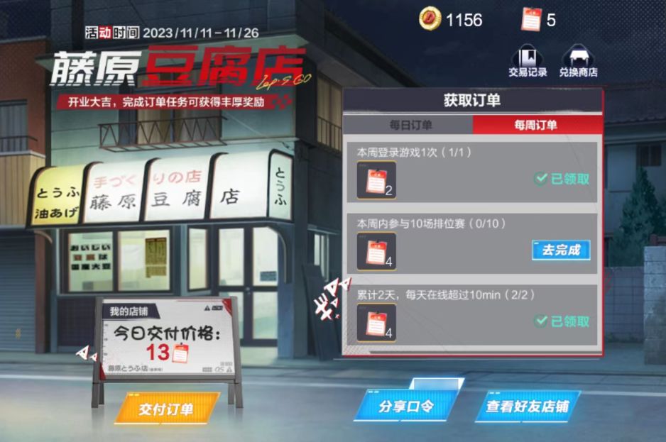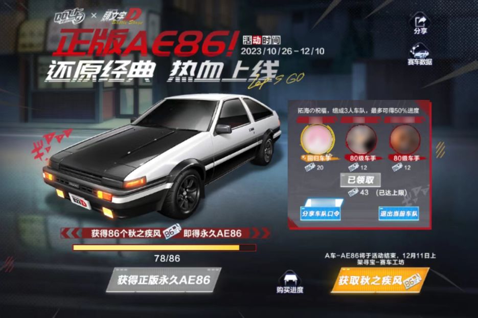 小橘子温馨提示:QQ飞车×头文字D联动福利持续放送中,车手们别忘了前来领取正版A车AE86呀!同时,拓海的秘密&藤原豆腐店活动将在11月26日结束,记得在活动结束前及时参与兑换哦~