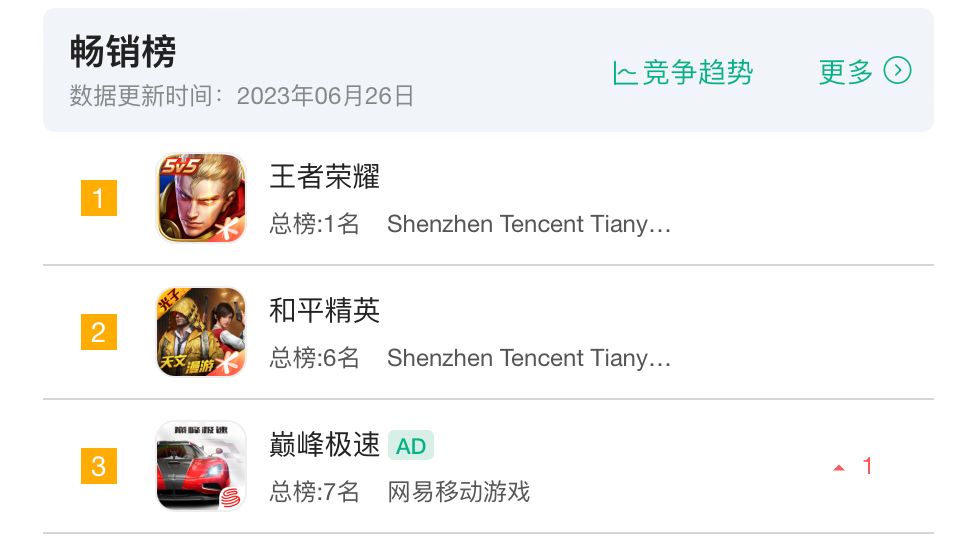 随着时间推移,《巅峰极速》经历住了后续的考验,在市场上成功站稳了脚跟。现在游戏稳定处于iOS畅销榜Top50左右,偶尔遇到新版本更新,还能冲进Top10。
