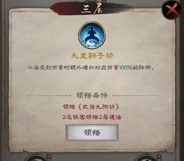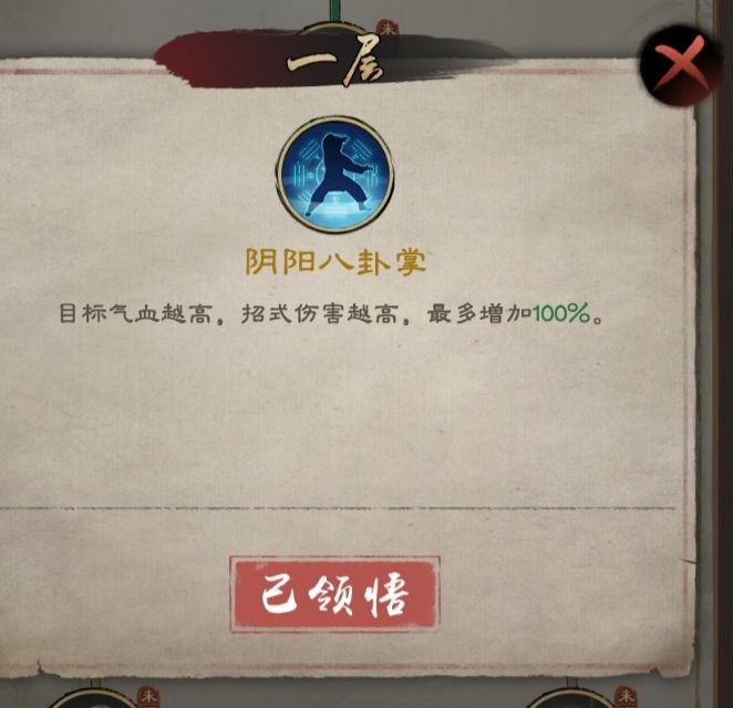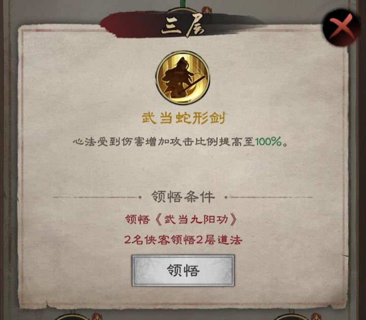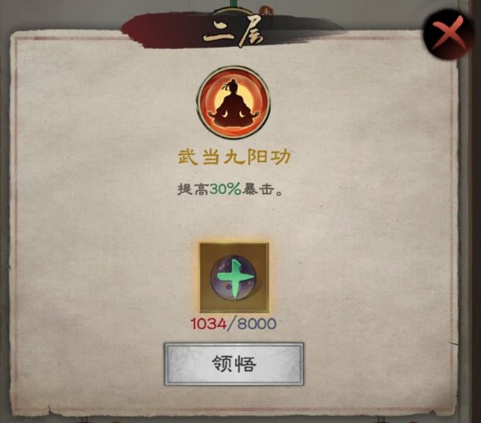 按照我的理解是:先点一层阴阳八卦掌,然后点二层的武当九阳功,再然后点三层的武当蛇形剑,再再然后点四层的太极心法,最后点太极拳法!