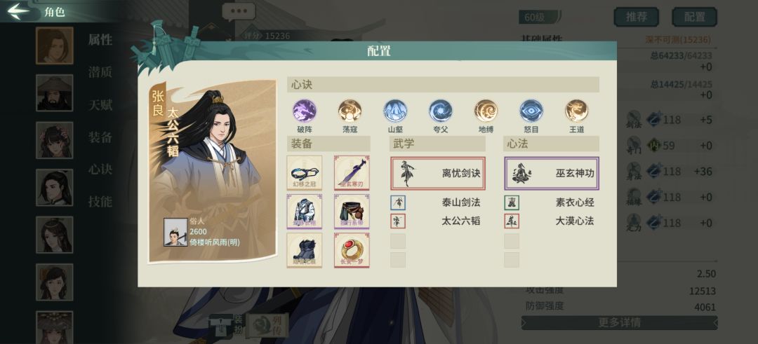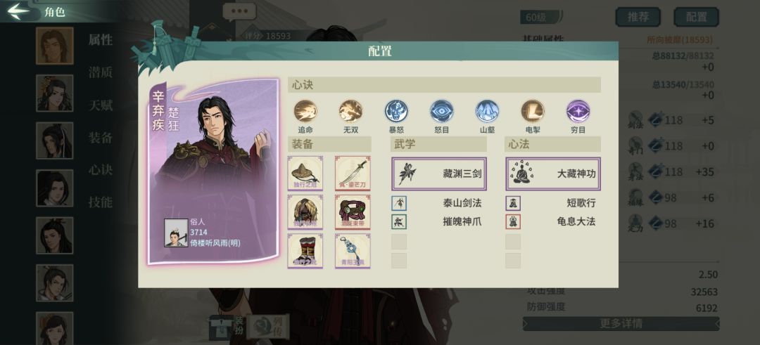 纳兰用镇海是追求肉度,保证纳兰站到最后一直触发罗刹剑,三突用双身法,辅修迅雷剑下电掣换地缚,带清心。薛涛没什么好说的。我感觉王维作为一个辅助作用核心还是清负面,防止主角被控死,另外王维减伤不够,所以用双羽镜子补足,蚩尤甲只要能给对面输出上debuff就行。如果不用王维可以太极陆游,有糖丸绝可以换千幻陆游,但是不好拿全,我是单用抢人。老辛不好拿作为替补,如果对面没ban可以抢,老辛抽得多可以换上大藏龟息,主要是刷渊默和集气。另外离忧张良可以压阵,对付八门通玄白衣有奇效,也能防佛刀的身法压阵,有时候一波就推了对面输出,张良死快点效果比较好,能放出巫玄就值了,有时候张良纳兰的压阵非常强,吃掉对面脆皮。