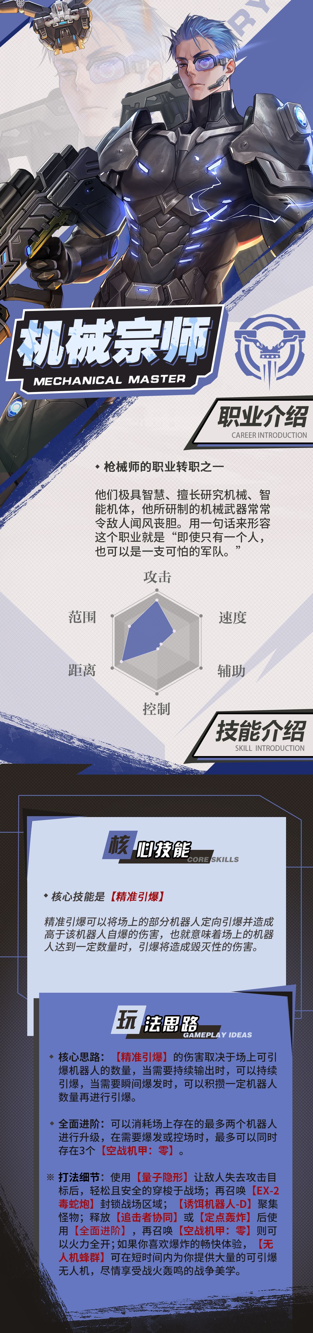 ▷『机械宗师』是枪械师的转职之一,拥有着非凡智慧的机械专家,能用尖峰智能制造各种强悍的机械武器,制霸战场!