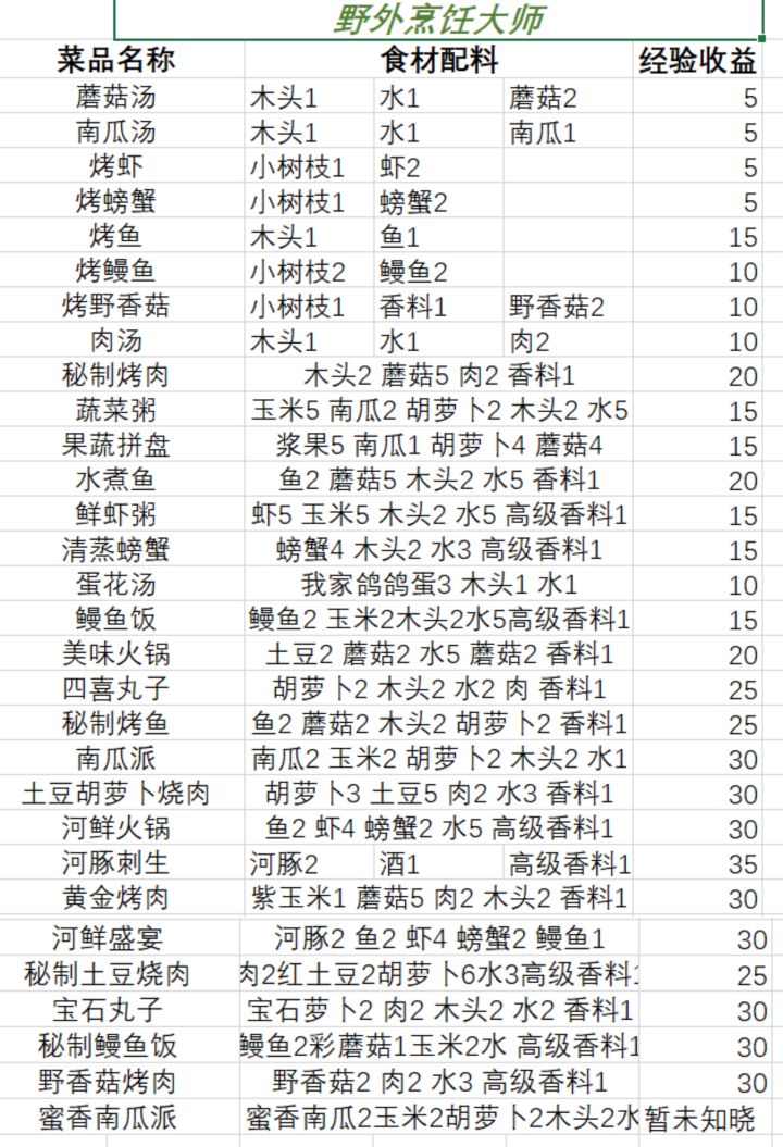 在这之前先附上自己做的一张各种食物的材料以及经验图,如下所示: