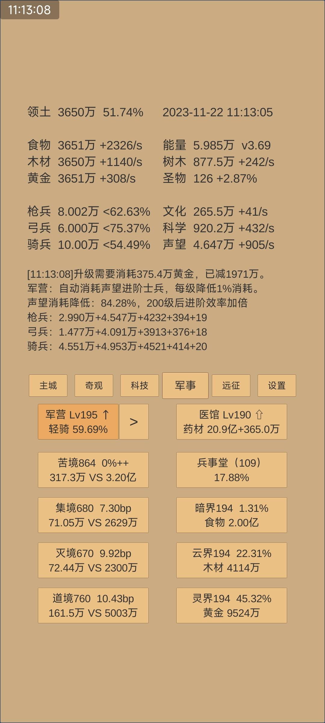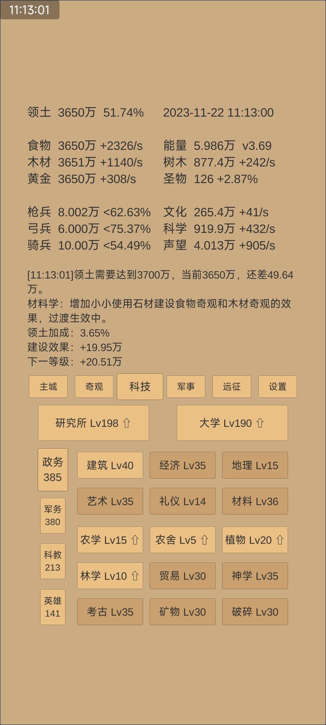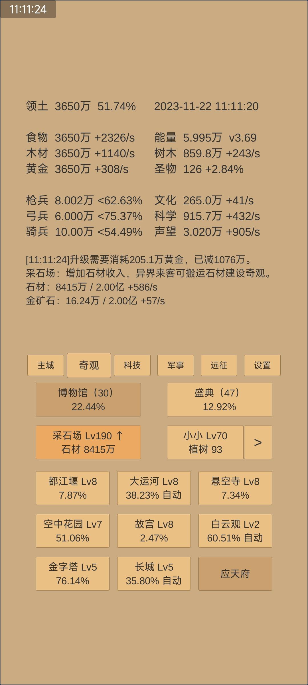 原计划是111兵事堂开200级建筑,群友建议先出博物馆,算了算好像当前确实是博物馆更优,毕竟黄金比科学值钱一点,单算黄金都不亏了,粮木算净赚。
