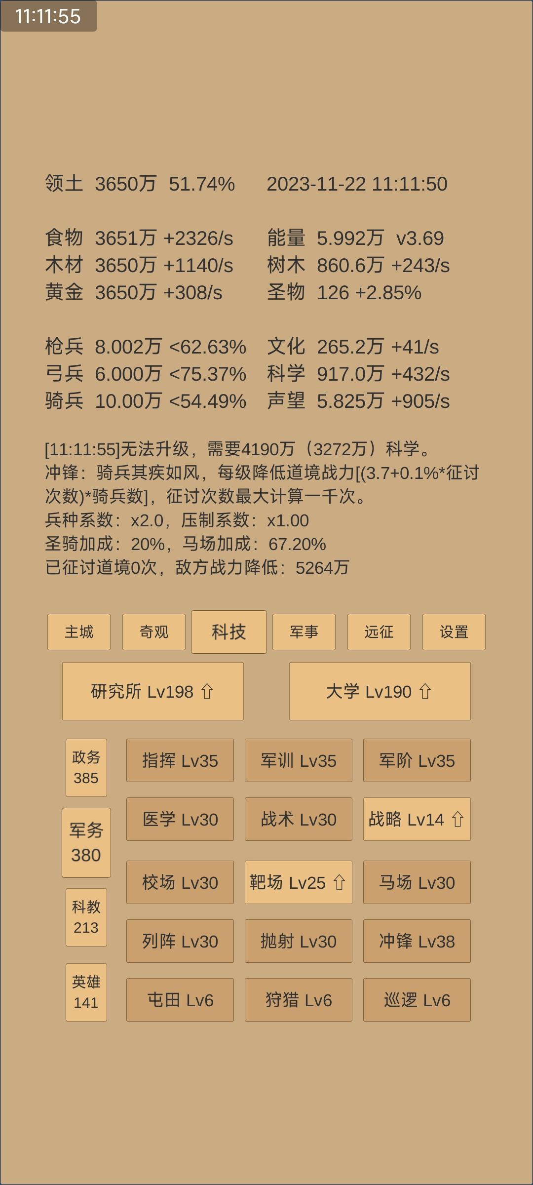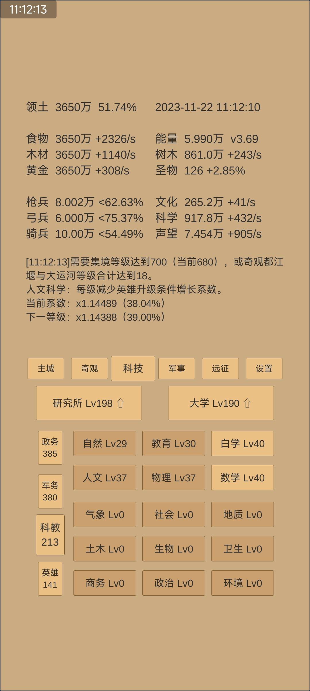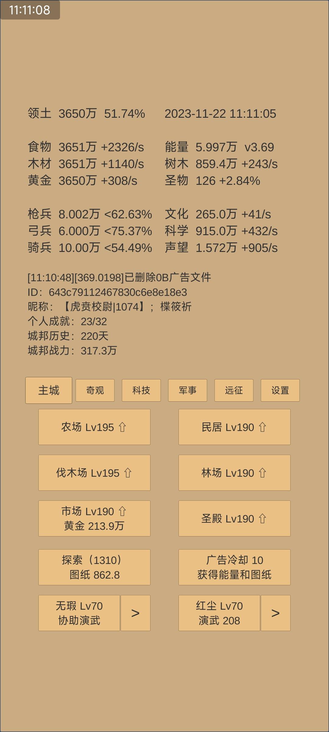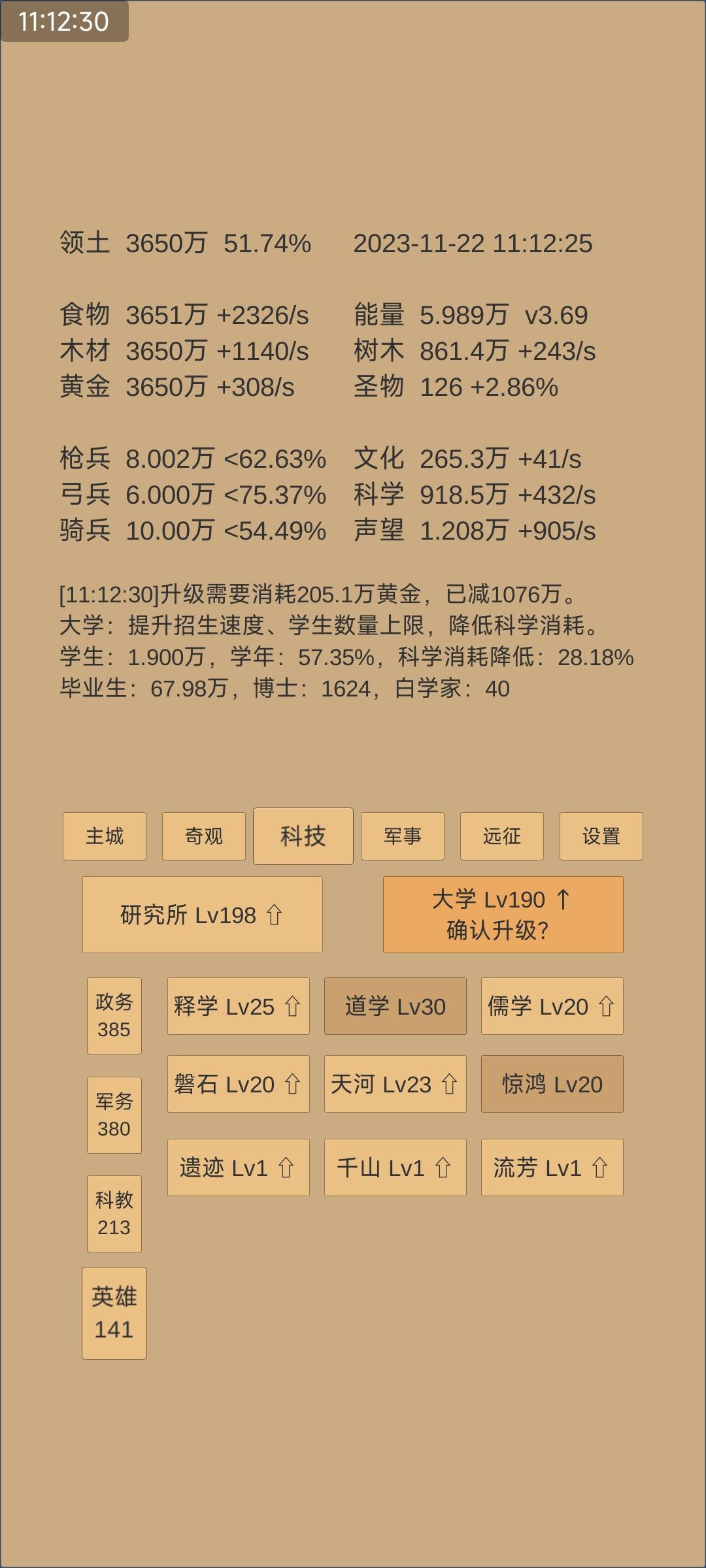 原计划是111兵事堂开200级建筑,群友建议先出博物馆,算了算好像当前确实是博物馆更优,毕竟黄金比科学值钱一点,单算黄金都不亏了,粮木算净赚。