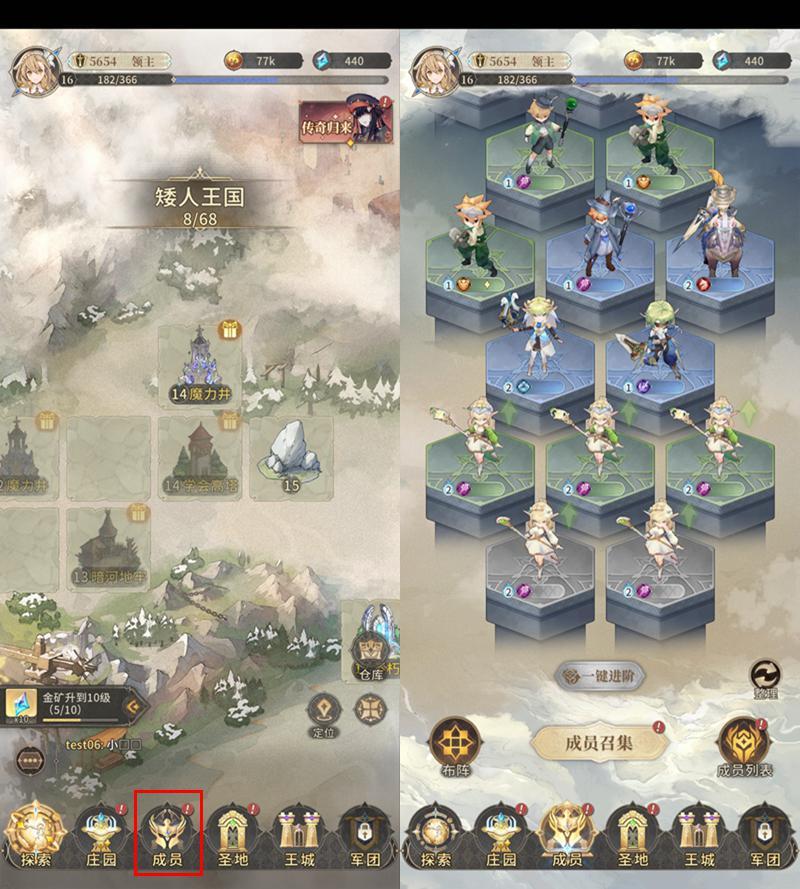 当我们在成员大厅召集到相同品阶的成员时,就可以使用成员页面中的进阶功能,让两个相同品阶的成员进行合成进阶,成员品阶从青铜、白银、黄金、铂金、钻石、圣域、传奇、半神一共分了八个品阶,每个品阶需要进阶的次数也会增加,前文提到的成员等级上限也取决于成员的品阶。进阶也可以通过在召集大厅拖动相同品阶的成员完成,在手动拖拽30次进阶之后,我们还可以解锁“一键进阶”功能,非常方便。品阶提升之后,角色的基础属性会有一个质的飞跃,如果在冒险中卡关了,不妨试试成员召集提升队伍中成员的品阶吧!