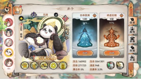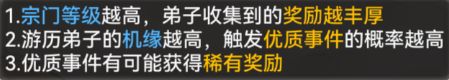 2. 六维中的机缘相当于运气,解锁了传送阵之后可以派遣弟子游历获得各类有用的资源,弟子的机缘越高,触发优质事件的概率就越高
