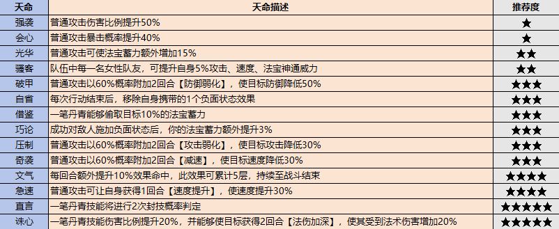 只有绝伦以上的高品质弟子才会自带天命,天命技能也有优劣之分,这里整理了一下各职业的天命排行,大家可以参考一下。值得注意的是,紫色弟子也可以通过服用九转金丹获得天命效果。