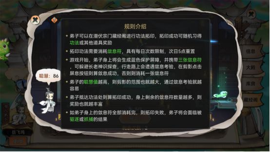 5. 聪慧值高的弟子可以派去npc宗门拓印功法,聪慧值越高,在敛息时的时候越容易