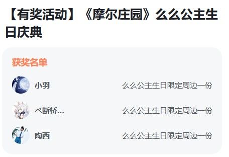 “《摩尔庄园》么么公主生日庆典盛大开启”已落下帷幕,艾米现在来开奖啦!感谢大家的热情参与!以下为中奖名单: