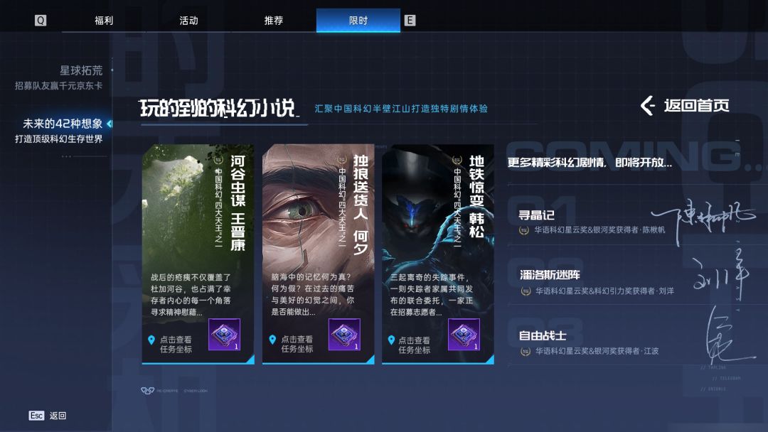 在『玩得到的科幻小说』中,由王晋康创作的【河谷虫谋】、何夕创作的【独狼送货人】、韩松创作的【地铁惊变】均已开放,点击任务详情即可查看指引,完成后能获得稀有芯片晶体道具。后续剧情将会陆续上线~