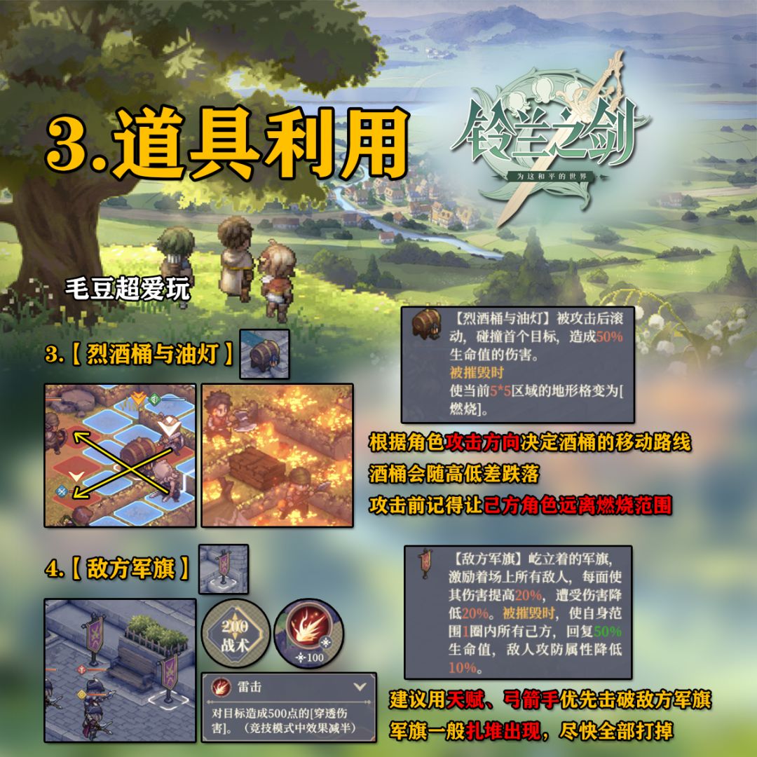 对【炸药桶】造成伤害会使其爆炸,对1圈范围的所有角色造成伤害,利用弓箭手等远程角色点燃炸药桶,或是运用【击退】能力避免对己方角色造成伤害。