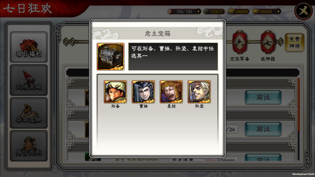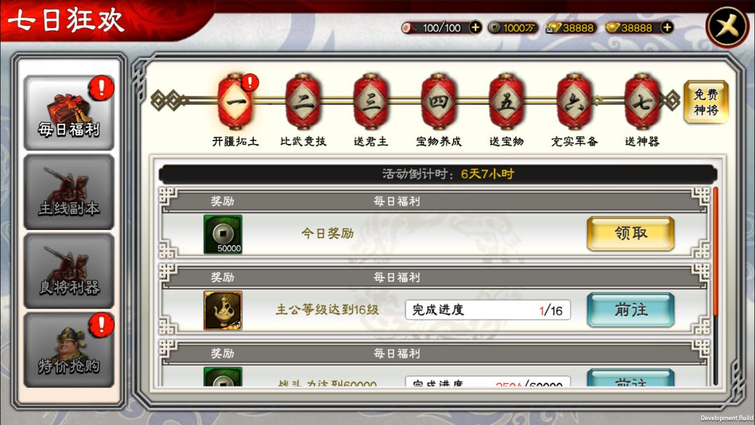 福利二:七日狂欢,稀有神将和稀有橙色装备登录就送
