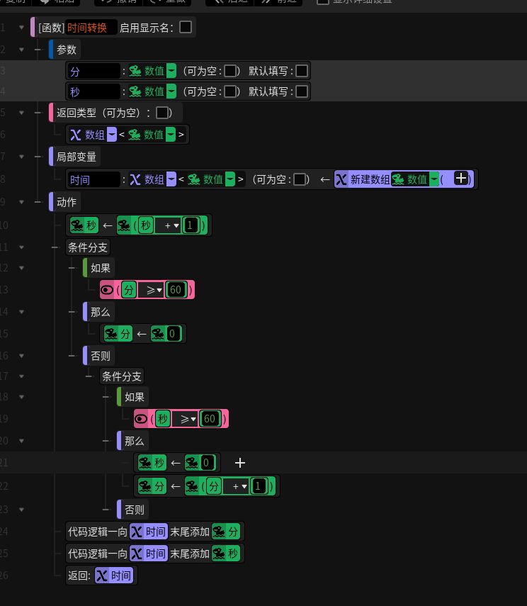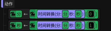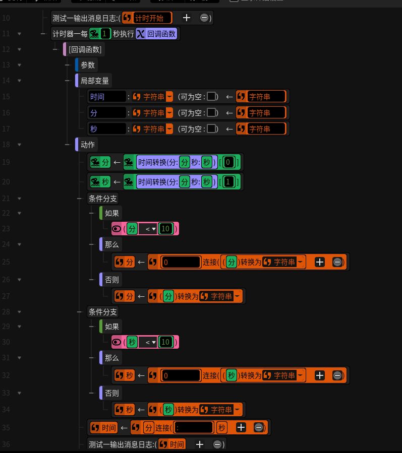 在回调函数中新建三个字符串变量:时间,分,秒。动作里面调用时间转换函数,传入参数为全局变量分,秒,重点是