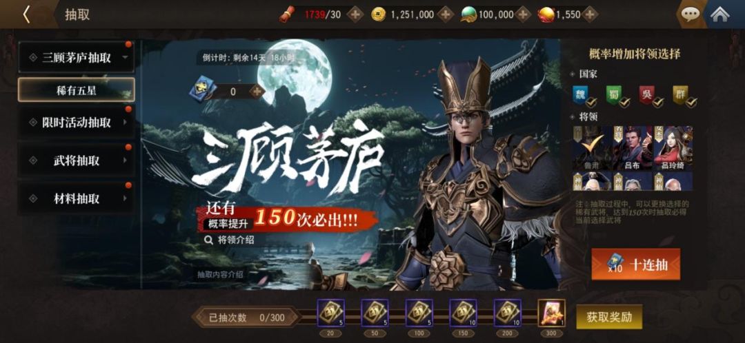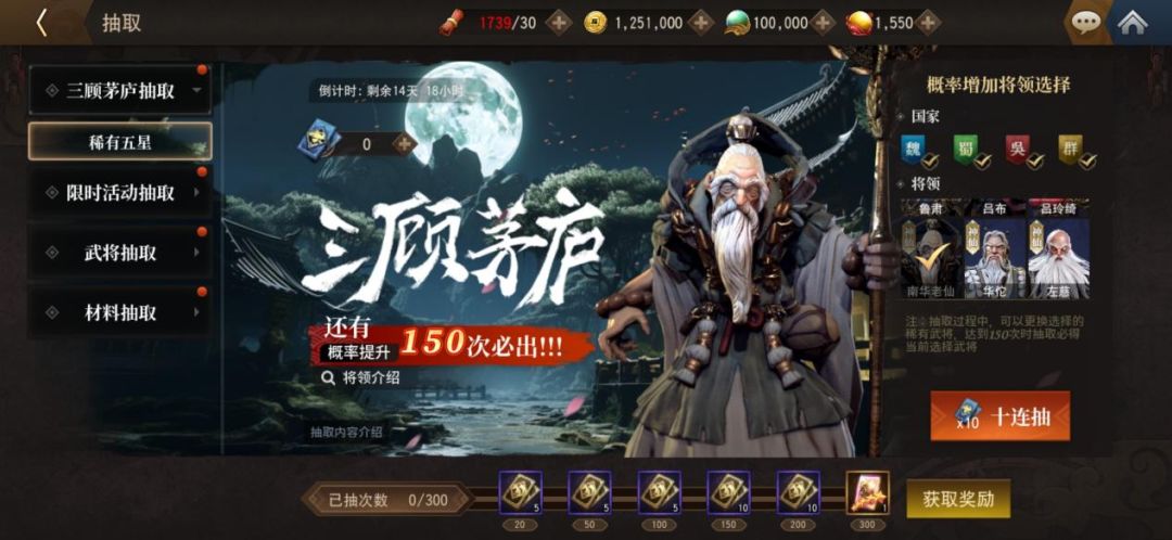 全新三顾茅庐卡池上线,新增鲁肃、南华老仙两位猛将,主公可以待选列表中选择任意武将获得概率提升!三顾茅庐中每150次抽取必定获取主公选择的武将!诸多猛将限时返场,静候主公!