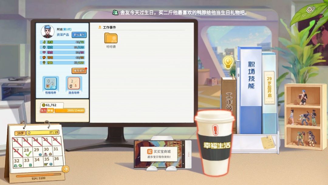 在剧情和战斗之后你都会产生压力,而幸福值的总量就决定了你能够承受的压力上限,这一点的逻辑其实大家也都能理解吧,就和我们现实生活中一样。压力逼近甚至超过这个上限之后,都会给角色带来不同程度的Debuff。这时候就要通过完成“幸福生活”里的小任务(买买买以及摸鱼、抢红包等小游戏)来提升角色的幸福值。