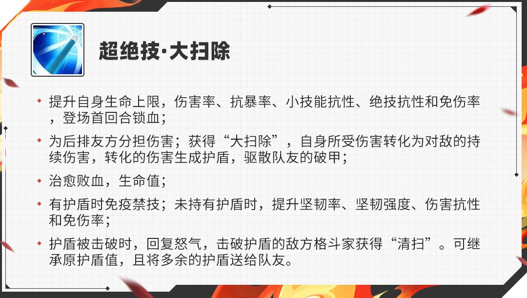 绝技解析:提升格挡和抗暴增加了莉莉凯恩前排的抗压能力,晕眩对手的同时还能转化持续伤害的余量,在吸取生命和怒气的同时也会给自己加一个类似“震慑”的效果来保护队友并刷新“清扫”持续时间且复制一个没有“清扫”单位的目标。若当下莉莉的护盾被击破时,击破护盾的格斗家也会被标注“清扫”让莉莉的刷盾频率得以保证。