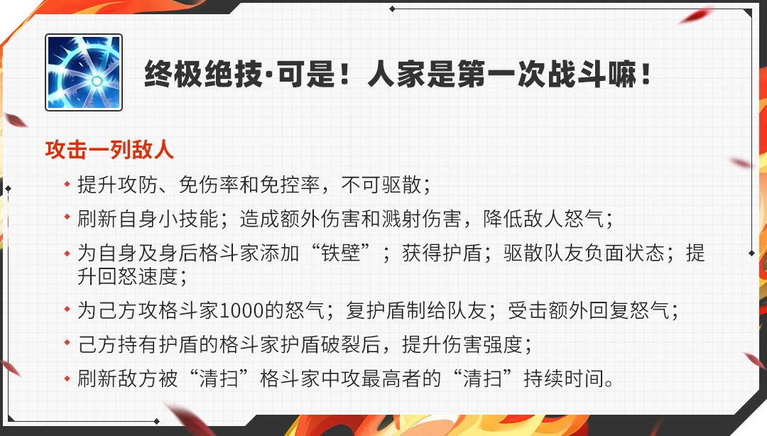 技能解析:攻击一列提升功防、免伤免控、刷新小技能让莉莉在自身回合的时候不至于被控还能增加“大扫除”单位,对目标的百分比伤害和溅射伤害可以说是防卡标配,毕竟纯纯的防卡也不指望她能打出高额的伤害,只要她能护住整体阵容不崩,加强己方输出能力就已经达标了。降低对方怒气、给予后排铁壁来增加后排的抗击打能力;一回合内,若单次受到伤害则给对方附加清扫,如果是四魂伤害的话就随机一名格斗家附加清扫单位,若其单位已有清扫就直接增加持续时间顺便驱散“强袭”和“铁壁”来削弱对手。若莉莉凯恩“清扫”的格斗家单位为0就为敌方攻击最高格斗家附加“清扫”来削弱敌方主要输出;2名则能驱散己方格斗家负面保证了被控玩家没法输出的短板;3名则提升回怒速度,一回合内受到降怒效果还能回复怒气让自身加快受击回怒的前提下还能在不至于被降怒的情况下开不出第二个绝技,如若敌方格斗家全部被清扫时直接清除自身负面状态,并且回500怒让莉莉开出第二段大招添砖加瓦,若我方上阵不含其他怒气强援格斗家莉莉就能给一位未满怒的格斗家提供1000怒气来加强己方的火力输出,若自身拥有护盾还能复制护盾给予在场没有护盾的格斗家,优先给怒气强援的格斗家,这个就是变相告诉大家莉莉就是为了保护后排输出而存在的!在自身护盾期间受击能额外获得怒气之外,莉莉还能给自己的盾友附加一个“盾反”的效果,如果盾友的护盾被击破立刻增加盾友伤害强度且下一次绝技对敌方随机一名格斗家造成莉莉自身生命百分比的额外伤害,刷新敌方被“清扫”格斗家中攻最高者的“清扫”时间,并使其效果提升30%。