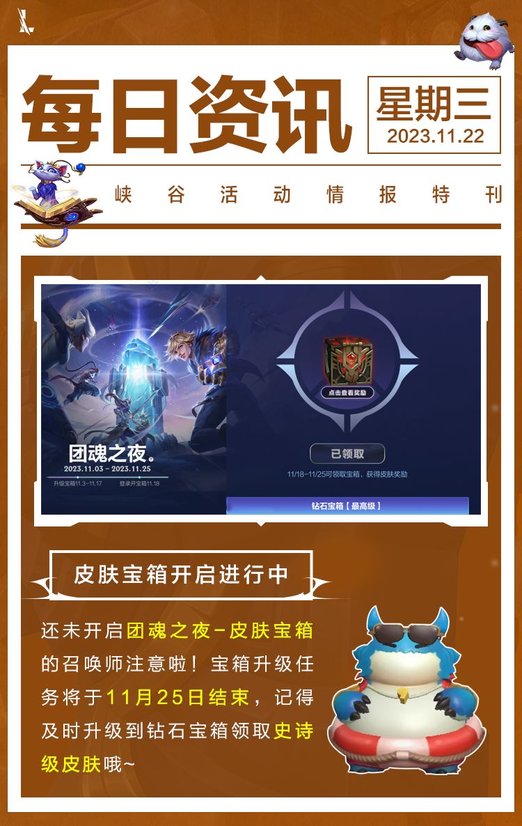 4.4b版本将会在11月23日(明日)更新,在那之前,不要忘记领取游戏内的福利哦!全新英雄希维尔将于北京时间11月24日早上10点上线,召唤师敬请期待吧~