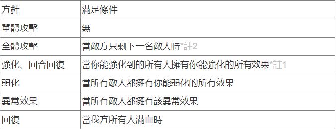 注1:例:全体力敏上升技能使用强化方针时,只要我方全体有1人缺乏力或敏其一便会使用强化。