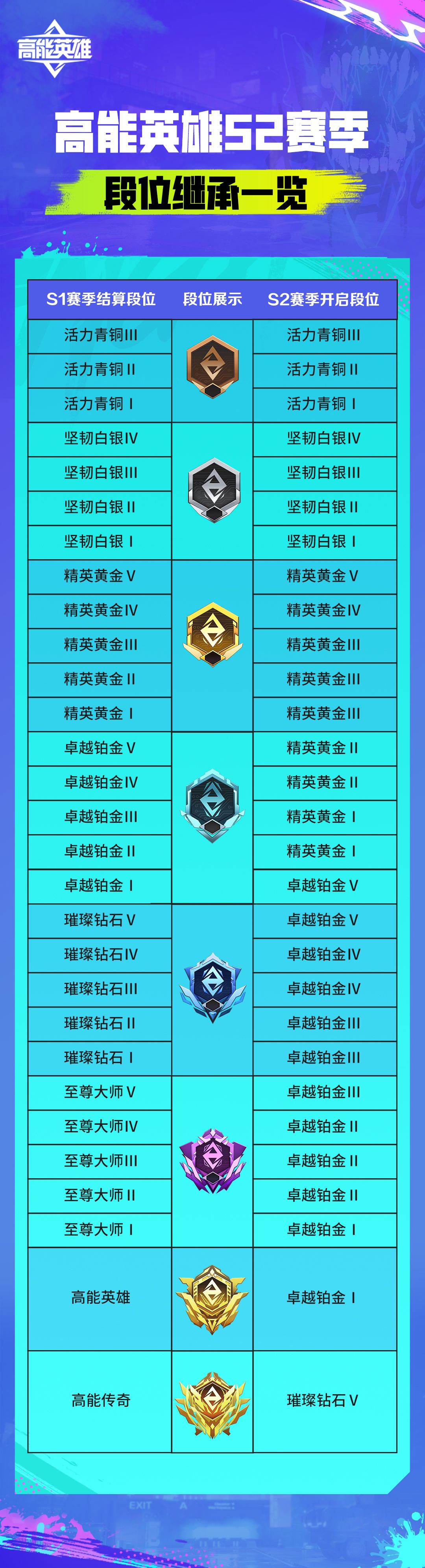 2. S2赛季开始时,【精英黄金III】及以下段位玩家将保留S1赛季段位,【精英黄金IV】及以上玩家将以11月28日00:00前进行的最后一局游戏的结算段位为准,并在S2赛季开启后按一定规则进行继承,【高能传奇】段位的玩家将会获得专属的旗帜背景奖励;