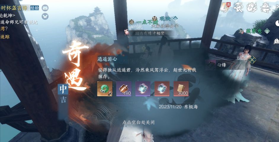逍遥门奇遇/加入逍遥门教程:中吉奇遇【逍遥游心】打副本选择任意一个副本,进去打的时候使用【一键连招】功能,有概率可以触发逍遥门奇遇【逍遥游心】。