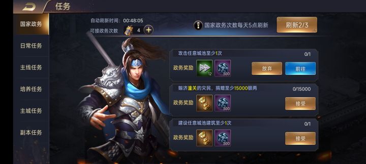 国家政务十分重要,请尽量用完使用次数,国家政务是爵位升级的一道坎,必要时可以50元宝甚至150元宝买一到两次政务,这样更加有利于前期快速提升爵位