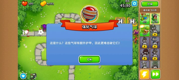 freeplay模式中气球血量会随回合数成长,后期气球血量会成长到极其恐怖的程度,强化也就变成了最具威胁性的属性(力大砖飞