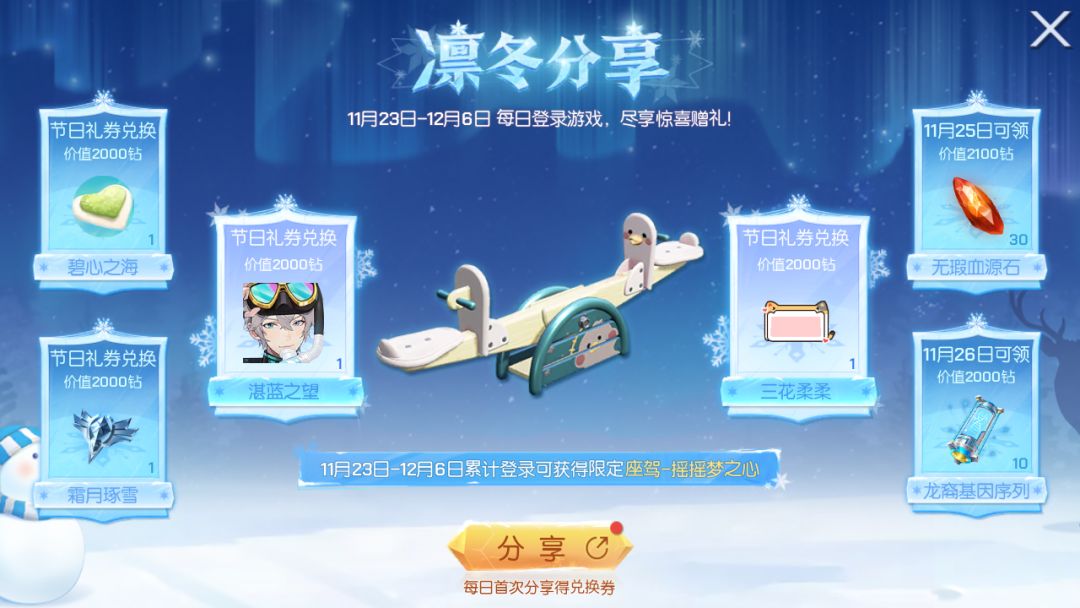 活动期间,每日参与活动可获得踏雪寻梅礼盒、座驾焕纹道具等奖励,快来西伯利亚冰港跟小伙伴们一起愉快地玩耍吧!
