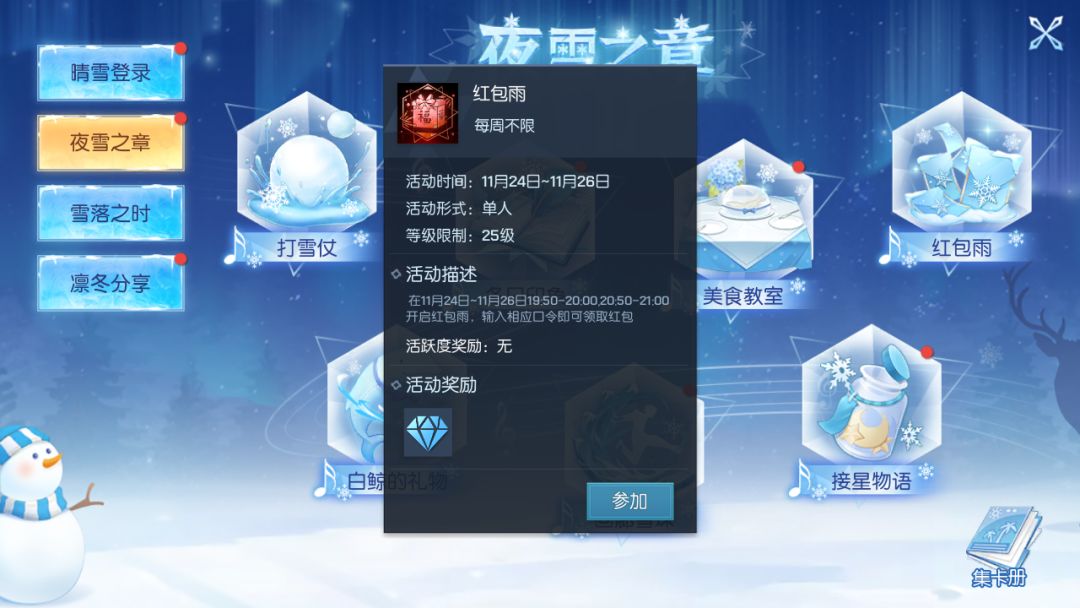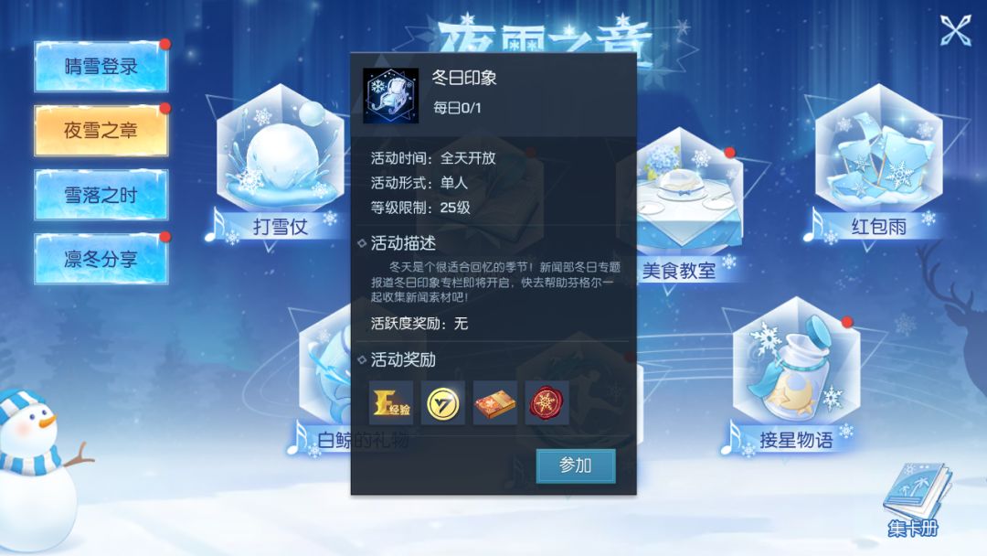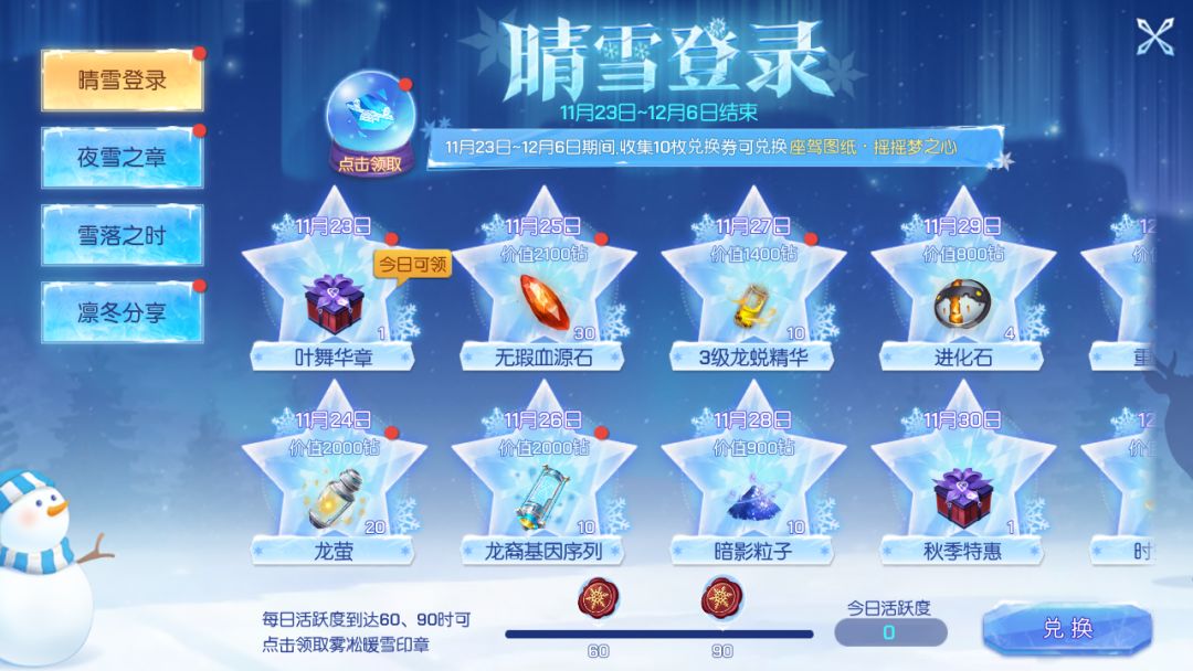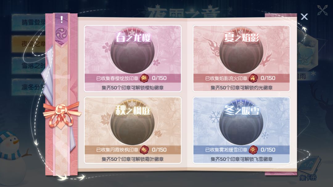 活动期间,通过每日登录、每日分享、参与节日活动等方式收集指定数量的雾凇暖雪印章,即可在集卡册·冬之暖雪界面解锁限定徽章~