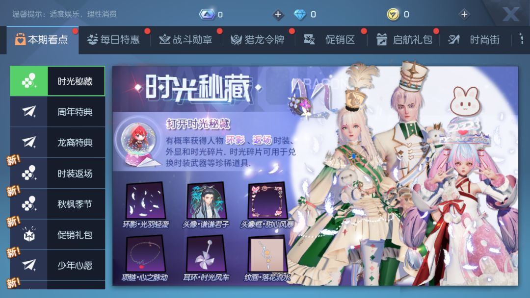 铛铛铛!时光秘藏携人物环影、往期时装武器、时装、发型、头饰等外观限量返场啦!首周外观概率将提升30%哦!