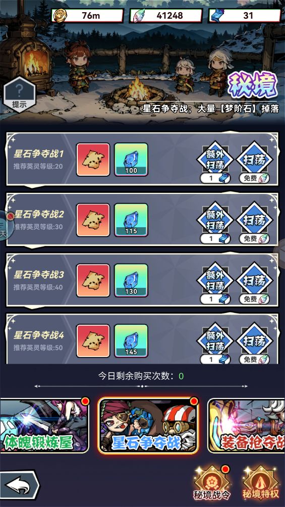和体魄锻炼屋、金币守护者同属于秘境下的日常资源副本星石争夺战难度分级为1-60层,每日总挑战次数上限为3次,该次数不共享,挑战失败不扣除次数,首次通过相应难度后可进扫荡战斗,有大量梦阶石掉落;