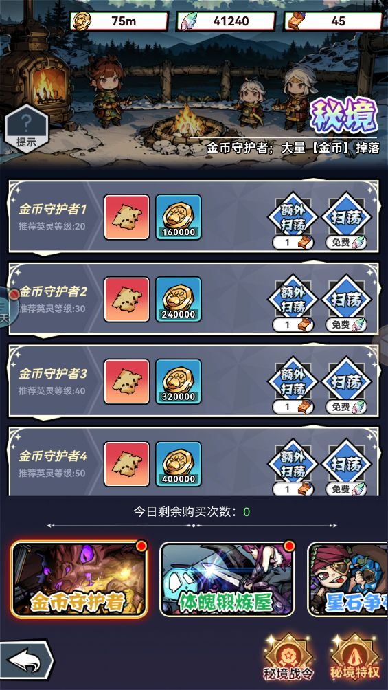 【进入方式】点击主页面下方 野外 秘境 金币守护者 即可查看副本规则和资源奖励