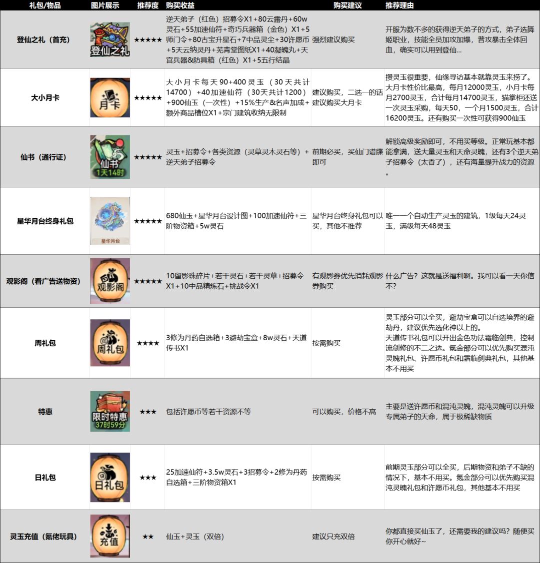 先整体说下,游戏不肝,氪度也不深,UP池也可以用灵玉来招募。零氪可以玩,但是偏休闲养生,资源积累和弟子提升会相对较慢。月卡和小氪的体验相对较好,灵玉积累快,up池基本都可以捞一捞,主力弟子的强度也基本在第一梯队,运气好一点的逆天弟子也可以和大佬硬刚。中氪和重氪就是强度党,排行榜常客,版本答案看大佬的队伍即可。本人属于小氪,今天主要给大家分享微氪小氪的性价比选择。
