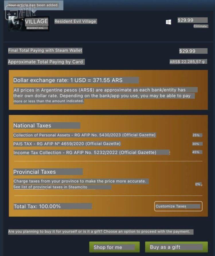何况以上的讨论均忽略了一个前提:Steam的商店定价均为税前价格。仍以阿根廷为例,在2023年买游戏的税率高达100%,意味着现在的阿根廷玩家,购买一部定价未经修改的游戏,要花费两倍于美区定价的价格。