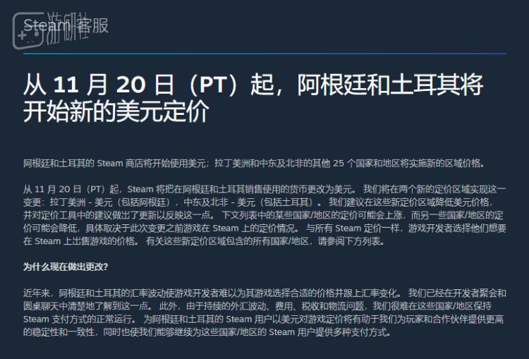 近一个月前,Steam发布公告,计划对阿根廷和土耳其的定价进行调整,作为定价基准的阿根廷比索和土耳其里拉一律改成美元。