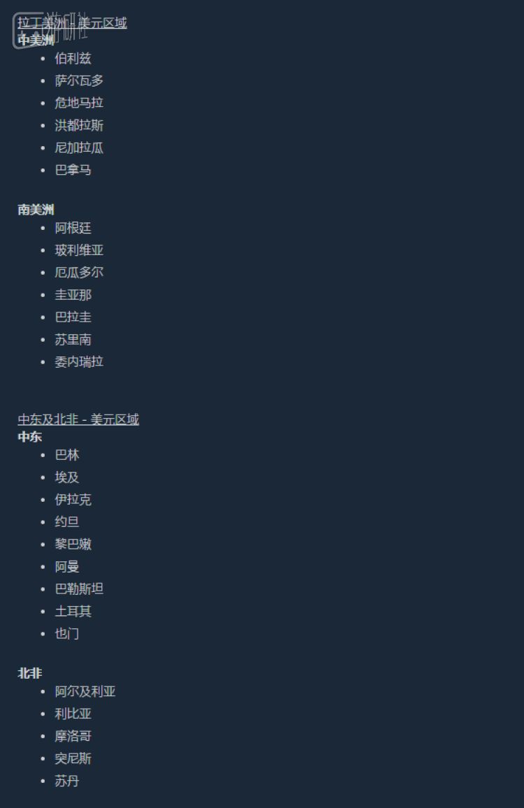 这本质上相当于取消了阿根廷和土耳其区。原有的两个区将被分别并入两个“区域定价”的大区,分别是“拉丁美洲”(LATAM)和“中东及北非”(MENA)。两个大区加起来有25个发展中国家/地区,这些国家/地区的游戏定价标准统一使用美元,而非当地货币。