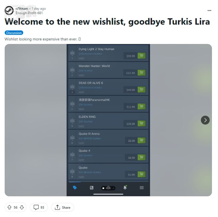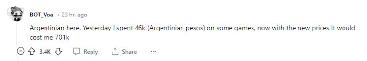 从这一天起,在Reddit的Steam子版块,涌现出大量的阿根廷和土耳其玩家,对上涨了数倍乃至数十倍的定价表示愤怒和悲哀。