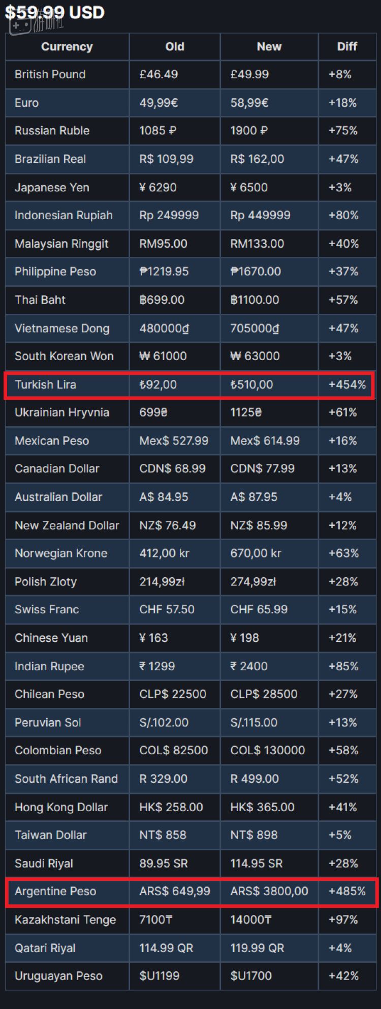 按这一标准重新定价,一款定价60美元的游戏,放到土耳其区的涨幅高达454%,而阿根廷区的建议定价上涨了485%。