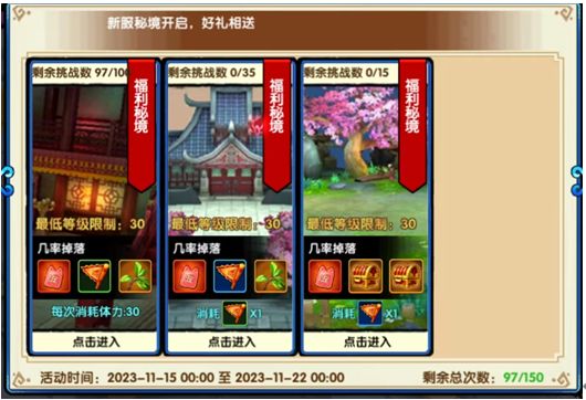 活动时间:新区开服第2、 7、 12 、14 、18、22天。本次时间:11.15 0点-11.22晚上10点,老区不定期开放长留秘境。第一个福利秘境副本,最低等级限制30级号可以进入,每次消耗30个体力,可以挑战100次。次数比较多,珍贵奖品掉落几率小。有机会掉落红宠卷、仙草、硬黄残卷。掉落珍贵物品:门票硬黄残卷