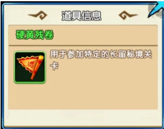 第二个福利秘境副本,最低等级限制30级号可以进入,每次消耗1个硬黄残卷,可以挑战35次,次数比较少,珍贵奖品掉落几率比上一关大很多。有机会掉落红宠卷、仙草、残卷、皓白残卷。第二关门票:硬黄残卷
