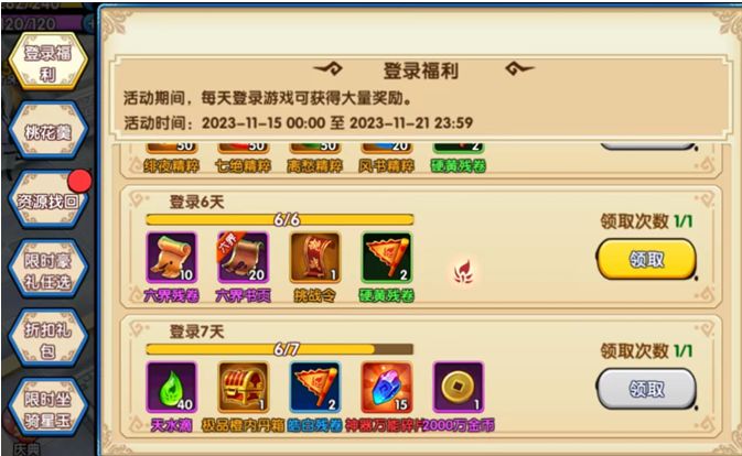 可见第三关可以同时掉落一种或几种珍贵物品,是小伙伴最喜欢的福本,不过门票皓白残卷比较少,经常15次没打完,让人遗憾。这点系统也给上仙们想到了,除了在副本里有机率掉落,还可以在7天登录福利里每领取到8张硬黄残卷3皓白残卷。上仙们别忘记每天登陆领取。