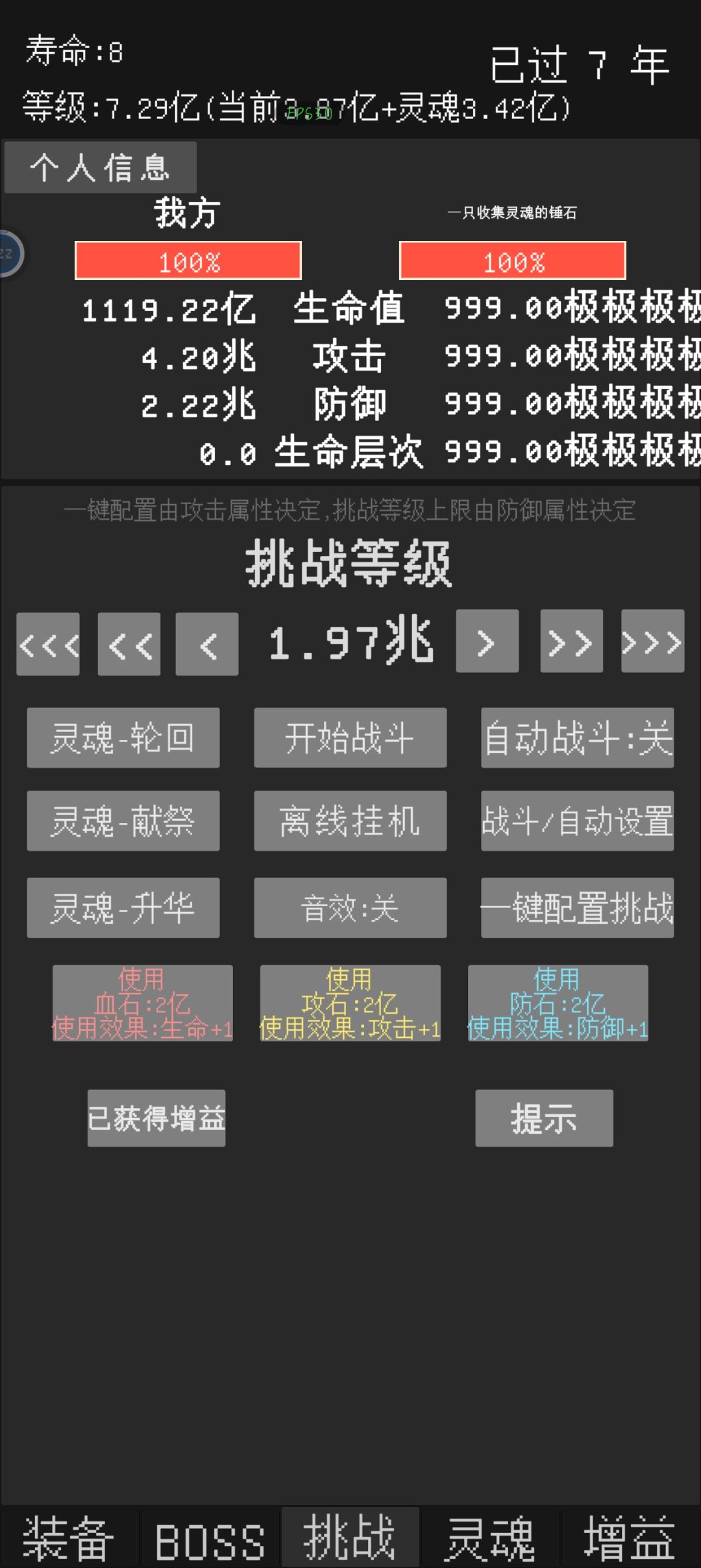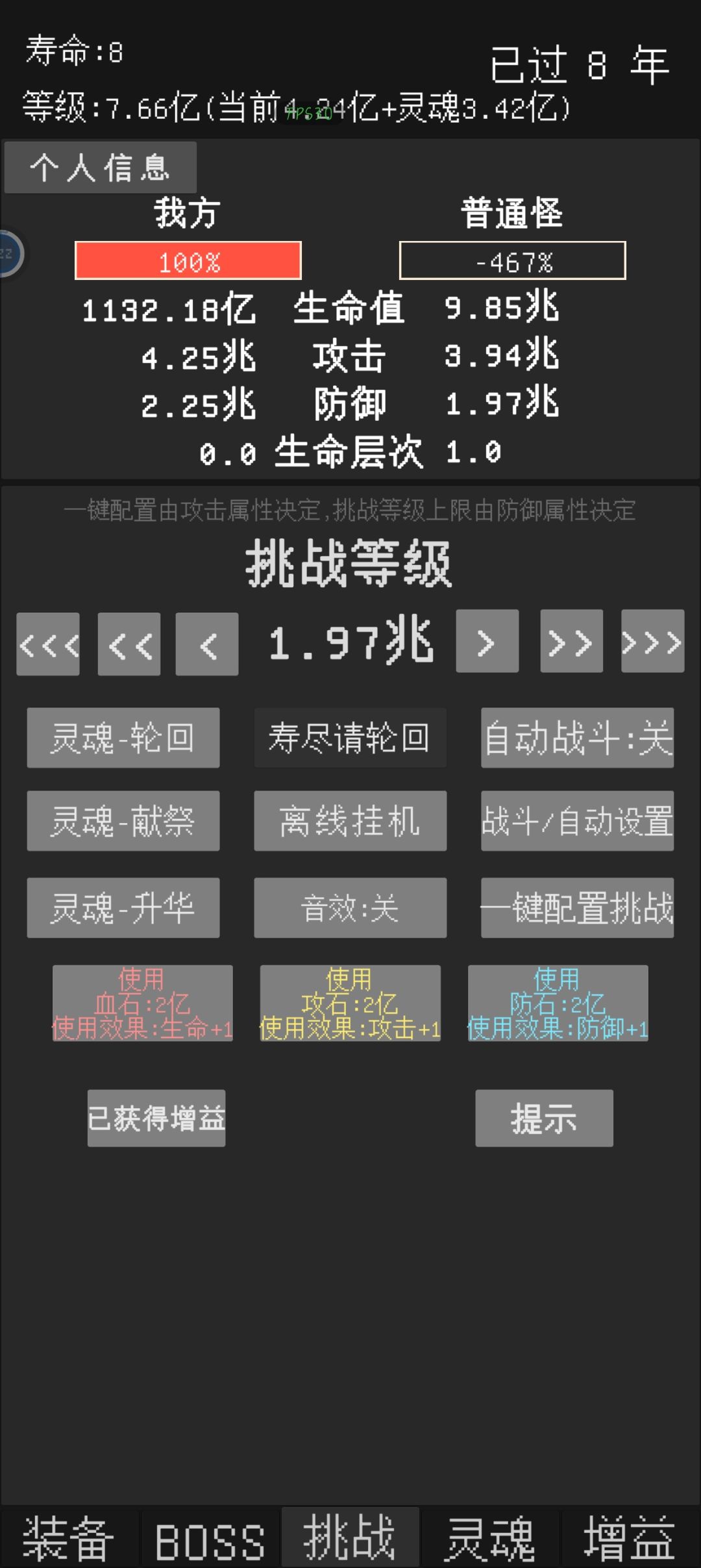 反馈一个小bug,在自动战斗关闭,自动轮回关闭的情况下,寿命到头时可以通过打锤石然后按重置来回一年寿命,所有除了寿命以外的数值都和原本一样,可继续挑战一年。目前看来,重置后依然可触发重置,有个别时候可一次性重置两年。其中有次重置多了后正常的打怪也可以触发类似效果(当时没截图)不过之后就没出现过了(主要是没那么闲了)