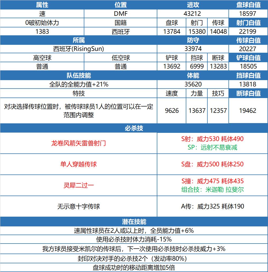 主要能力:机会制造者、80%封2技、必杀热线3%、减耗15%、盘球5倍。