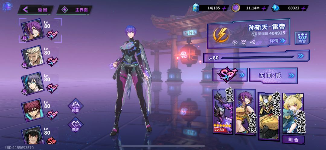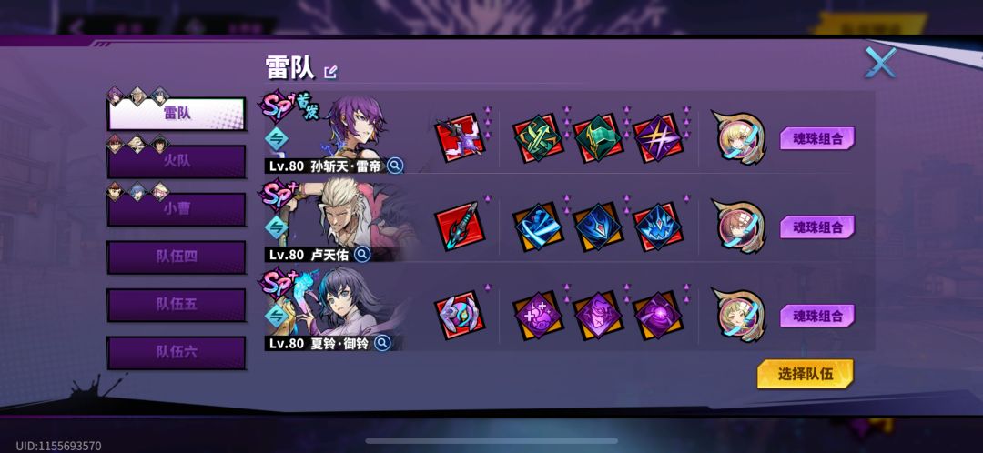 阵容由孙斩天、卢天佑、夏玲·御玲组成,其中孙斩天及卢天佑负责输出伤害,夏玲负责打时停提供增伤,这套阵容目前在小将的区里每天的镇魔令还是可以拿到一个不错的成绩的,其中只有孙斩天需要使用券抽到SP+,吕天佑及夏玲都可以每天刷碎片,建队成本比较低。缺点是目前孙斩天没有UP池,需等待返场或者其他的雷系主C出现,阵容组成如下图: