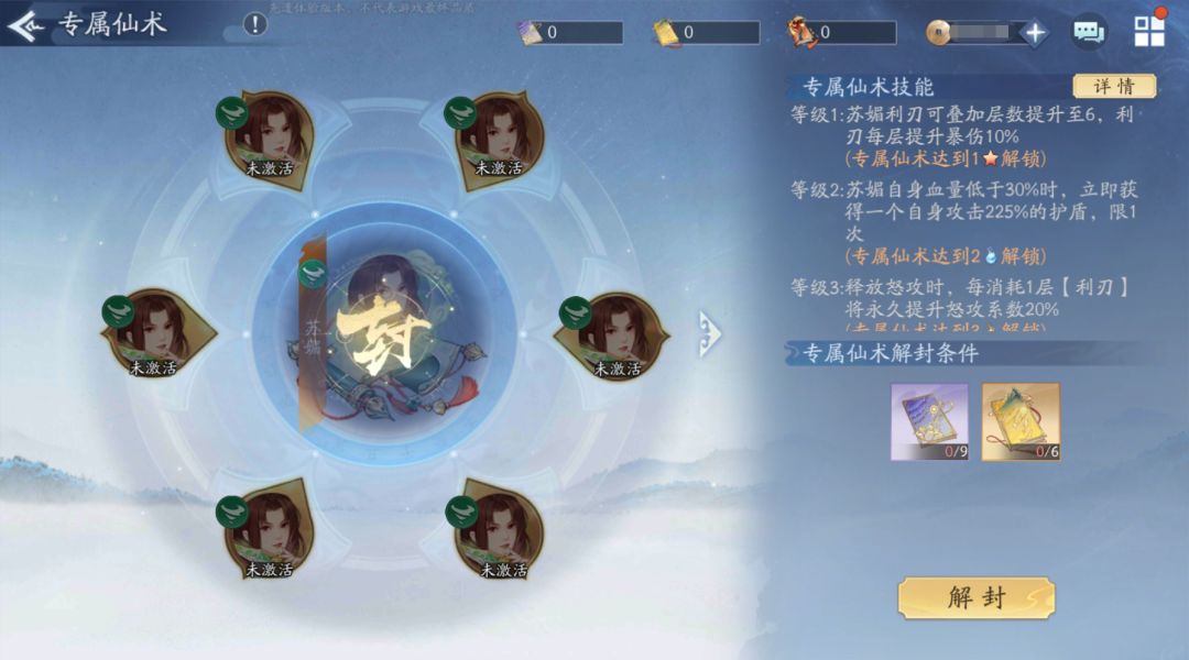 (2)专属仙术可提供属性加成,并有对应的专属仙术技能,满足解封条件后即可解封专属仙术;