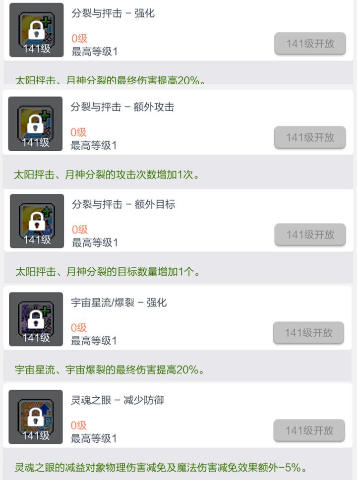 首先魂骑士的主要输出方式是1级就解锁的双形态普攻,也就是太阳抨击/月神分裂,所以要优先强化,按照顺序依次点,分裂与抨击强化,额外攻击,额外目标,效果是提高终伤,攻击次数和目标数量,将主要输出强化到位。