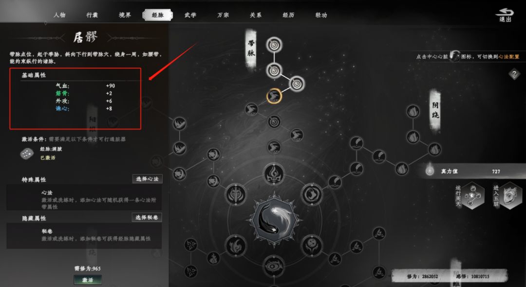 在《下一站江湖II》游戏中,角色获得修为感悟后可进行经脉激活,激活经脉会获得基础属性成长,并可在激活或洗练时使用攻体心法获得经脉的特殊属性,使用秘卷获得经脉的隐藏属性。